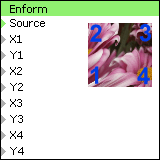 Filtr "Enform" odstraňuje deformaci obrazu pomocí 4 nezávislých vrcholů. Filtr působí opačně než filtr Deform. Souřadnice představují souřadnice vrcholů uvnitř vstupního obrazu (v rozsahu 0..1), čímž lze řídit natahování a zvětšování obrazu.