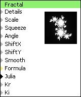 Julia - přepínač režimu Julia fraktálu. U Julia fraktálu se namísto souřadnice bodu C použije konstanta K, zadaná pomocí vstupů Kr a Ki.