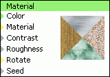 Filtr "Materiál" generuje vybraný materiál. Účelem je snadné nastavení parametrů materiálu. Je-li potřeba podrobnější nastavení parametrů materiálu (jako např. měřítko), lze použít samostatné jednoúčelové filtry materiálů.