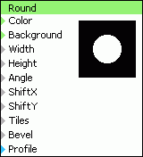 Profile - vstup průběhové křivky určující průběh úkosu hrany. Pro souřadnici X průběhové křivky je použita hodnota z úkosu hrany (tj. 0=pozadí, 1=popředí). Hodnota zjištěná z křivky se použije jako stupeň prolnutí barvy popředí a pozadí. Hodnota pro X=0 se použije pro pozadí kolem kruhu a hodnota pro X=1 se použije pro popředí uvnitř kruhu, a to i mimo úkos hrany.