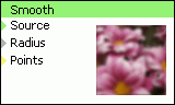 Filtr "Smooth" rozostří v malé míře obraz. Filtr použije několik bodů v malém okruhu a jejich barvu zprůměruje (s různou vahou). Filtr může značně zpomalit renderování obrazu a v detailech mohou být patrné ostré přechody (z důvodu omezeného počtu bodů).