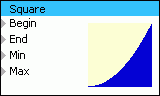 Filtr "Square" je generátor křivky druhé mocniny. Výstupní hodnota filtru je závislá na horizontální souřadnici X podle vztahu Y=X^2. Souřadnice X i výstupní hodnota jsou typicky v rozsahu 0..1.