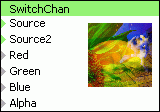 Filtr "SwitchChan" umožňuje plynulý přechod jednotlivých RGBA kanálů mezi 2 obrazovými vstupy v závislosti na přepínacích signálech.