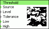 Filtr "Threshold" detekuje hraniční úroveň jasu obrazu porovnáním s referenční úrovní Level a nahradí ji barvou Low (je-li jas Source nižší než Level) nebo High (je-li jas vyšší). Alfa složka (průhlednost) je též převzata ze vstupů Low a High. Vstupem Tolerance lze rozšířit hranici detekce a tak přechody zjemnit. Signál není ohraničen na normovaný rozsah.