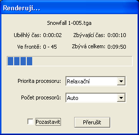 Přepínač "Pozastavit" zajistí dočasné pozastavení renderování, např. ve chvílích kdy je potřebný plný výkon počítače.