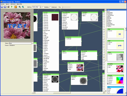 Jedna věc je používat již připravené generátory a druhá věc je vytvořit si generátor vlastní. Koho by bavilo generovat stovky barevných variací stále stejných knoflíků? Možná bychom si mohli upravit nějaký hotový generátor. Tak jestli máte z minulé lekce ještě vybraný generátor "Button Image", stiskněte na liště tlačítko "Otevřít generátor". Tím se vám otevře editor generátoru. Bude vypadat asi takhle nějak.