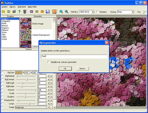 Vypadá to dostatečně "horrible"? No nic, tudy to asi nepůjde. Raději editor zase zavřete stiskem tlačítka Zavřít. Musíme na to odjinud, neboli "od píky". Takže znovu. A úplně od začátku. Jste v základní obrazovce programu. Vyberte si nějakou skupinu, kde si vytvoříte svůj vlastní generátor. Stiskněte tlačítko "Nový generátor". Objeví se dialog pro zadání jména generátoru. Něco zadejte, třeba "Test".
