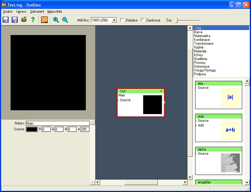 Nově vytvořený generátor není zcela prázdný. Uprostřed okna můžete vidět filtr, který má v levém horním rohu napsáno "Out". To je výstupní filtr. Každý generátor musí mít alespoň jeden výstupní filtr. Výstupní filtry jsou kanály, kterými se generovaný obraz posílá z generátoru do souboru.
