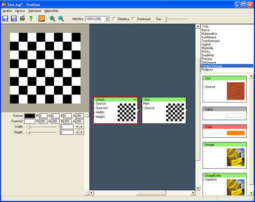 Kliknete-li nyní myší na filtr Check, ohraničí se červeným rámečkem. Rámeček indikuje, že filtr je vybraný. V dolní části levého pruhu okna se objeví ovládací prvky, kterými můžete nastavit parametry vybraného filtru. Táhla Width a Height mění velikost šachovnice (počet políček). Řádky Source a Source2 jsou obrazové vstupy. Nastavením barvy vstupů můžete měnit barvu políček šachovnice. Stisknete-li klávesu F1, zobrazí se nápověda k vybranému filtru.
