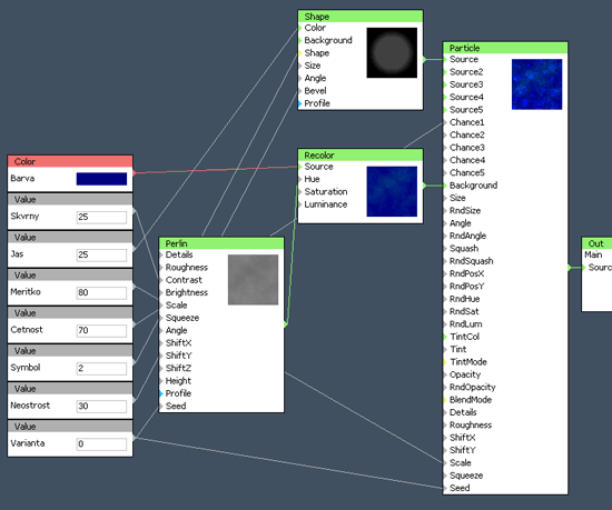 Aby bylo možné ovládat generování částic uživatelem, přidáme ještě několik vstupních filtrů Value. Filtr Value s popiskou Jas připojte na vstup Color filtru Shape, bude řídit intenzitu částic. Filtr Value s popiskou Meritko připojte na vstup Scale filtru Particle. Bude řídit velikost částic. Filtr Value s popiskou Cetnost připojte na vstup Chance1 filtru Particle. Bude řídit počet částic. Filtr Value s popiskou Symbol připojte na vstup Shape filtru Symbol. Bude vybírat symbol částice. U tohoto filtru se ještě zastavte a nastavte parametr Maximum na 14 a MaxVal na 0.14. To je z důvodu, že ve filtru Shape lze zadávat 15 symbolů s číslem 0..0.14 a krokem 0.01. Poslední filtr Value, s popiskou Neostrost, připojte na vstup Bevel filtru Shape. Bude řídit neostrost okrajů částic. A ještě připojte filtr Value s popiskou Varianta na vstup Seed filtru Particle. Celý generátor bude vypadat takto: