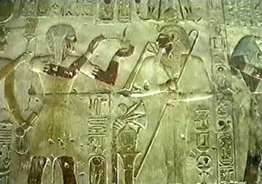 V první symbolické scéně nejvyšší kněz školy Hóra, oděný v jaguáří kůži, symbolu překonané původní zvířeckosti člověka, pomáhá při zrození faraóna Sethiho I. Takto se zrodila mysl, která se může zapojit do vývoje vesmíru.