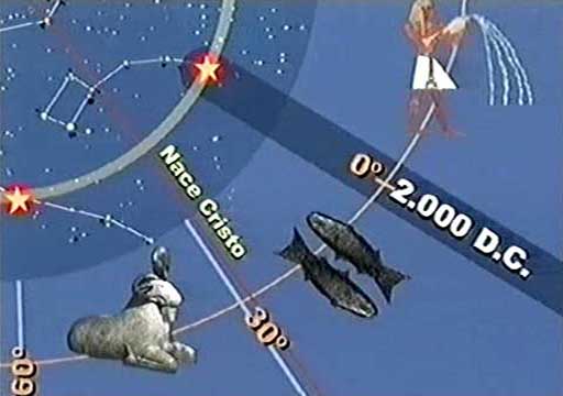 Podívejme se, kde se dnes nachází Sluneční soustava. Na nultém stupni ekliptiky. Na konci věku Ryb a na počátku věku Vodnáře. My se teď vrátíme o 180°. Do sluneční soustavy před 12 960 lety, o 180° nazpět, do souhvězdí Lva. Vědci tvrdí, že v té době končil playstocen, roztály ledovce a došlo k potopě světa. Tvar Sfingy spojuje dva symboly, jež představují zodiakální a polární konstelace - lva a člověka - a my díky tomu můžeme určit přesné datum.