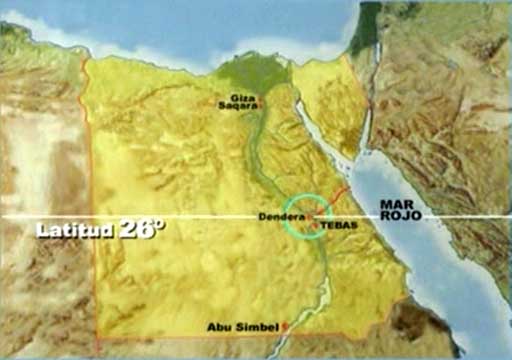 Náboženský komplex v Dendeře leží na 26° severní šířky. Byl zde počáteční bod starodávné cesty k Rudému moři. Později byly o několik kilometrů jižněji postaveny Théby.