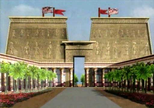 Dvě věže ve fasádě chrámu vymezovaly jižní polární hvězdu. Věže jsou svými přesnými zrcadlovými obrazy, včetně vytesaných reliéfů. Symbolizují symetrii v asymetrickém vesmíru, která umožňuje pohyb. V čele stojí faraón se žezlem a hrozí nepřátelům Egypta. Tento symbol se v egyptské historii častokrát opakuje. Na překladu je znázorněn okřídlený disk se dvěma hady. Hieroglyfy na věžích popisují krajinu s horami rámujícími slunce. Pylon, nebo fasáda, je 35 m vysoká, tedy jako 10patrová budova, a doplňují ji 4 velmi vysoké sloupy s dlouhými, jasně zbarvenými vlajkami, vlajícími ve vzduchu.
