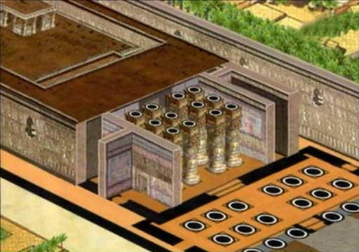 Z vnější světelné strany až k temné svatyni se podlahy chrámů postupně zvyšovaly, aby kněží při ceremoniích mohli pozorovat část oblohy přes hlavy svých žáků. Svatyně je nezávislou místností uvnitř chrámu, obklopenou dalšími prostory. Slunce sem dopadá světlíky a ozařuje původně barevné stěny.