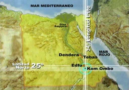 Na Nilu, 48 km na jih od chrámu v Edfu, blízko 25° severní šířky a 34° východní délky, nalezneme ruiny chrámu Kom Ombo, dříve zvaného Pa Sobek, neboli Panství Sobeka, symbolické síly reprezentované krokodýlem. Tento chrám není velkolepou stavbou jako chrámy v Edfu nebo v Dendeře. Původně ho chránily vysoké hradby. Obyvatelstvo chránilo královské vojsko, které zde trénovalo svoje válečné slony. Již od starověku se zde kromě pevnosti nacházel chrám zasvěcený oslavě polarity a duality všech věcí na světě. Za vlády dynastie Ptolemaiovců byl chrám přestavěn a jeho trosky se zachovaly dodnes.