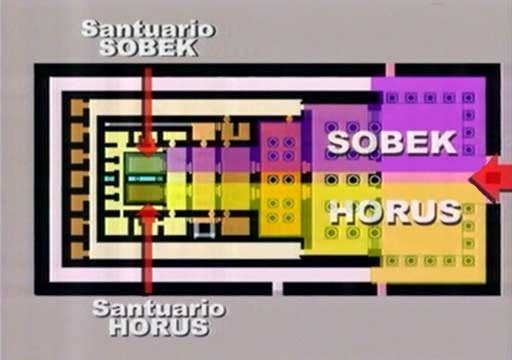 Symetrický chrám je rozdělen přesně na dvě části. Pravá, východní strana je zasvěcena Sobekovi a levá, západní strana Hórovi. Chrám se tedy soustředil na začátek a konec evoluční cesty vědomí. Hór, muž se sokolí hlavou a na ní umístěným zlatým diskem, byl symbolem trvalého vědomí. Představuje muže, který už poznal vše na tomto stupni reality, nesmrtelnou bytost povýšenou v hierarchii vesmíru. Člověka, který došel na konec cesty zdokonalení, kdy se z něj stal učitel a osvícená bytost, která se bude věnovat dalším úkolům vesmíru.