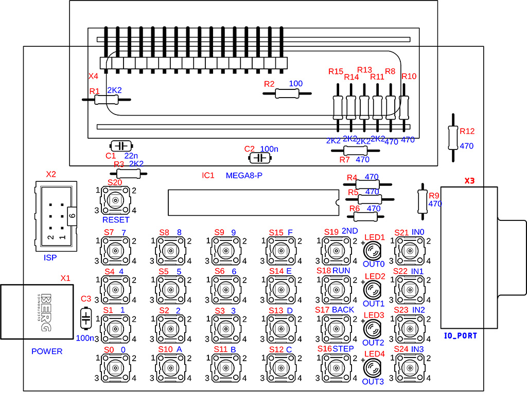 Program zapíšete od adresy 0xE00 a spustíte tlačítky 2ND RUNE. Stisknutá tlačítka IN0..IN3 budou rozsvěcovat LED na OUT0 až OUT3.