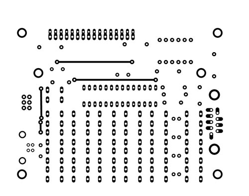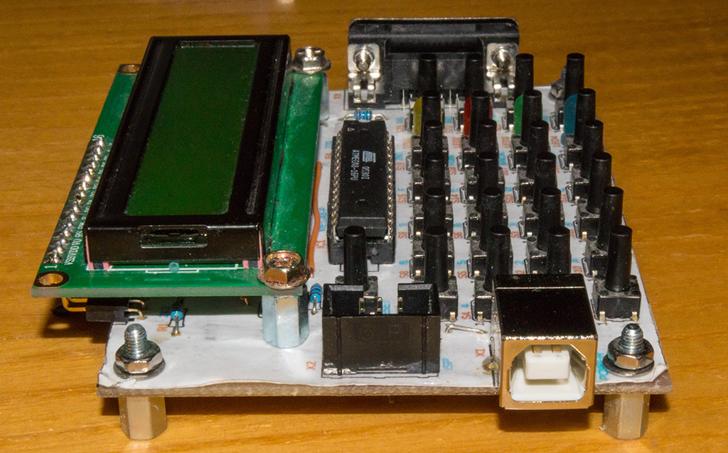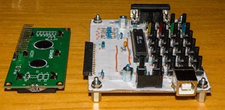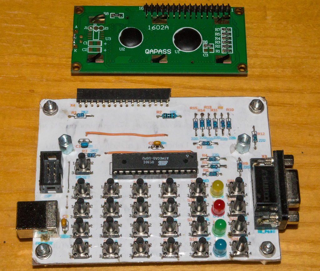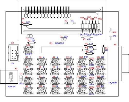 Deska plošných spojů má rozměr 100 x 75 mm a lze k jejímu návrhu použít free verzi Eagle. Plošný spoj vyrábím fotocestou z fotocuprextitu, zde stačí jednostranný. Jako tlačítka jsou použity mikrospínače bez přídavného hmatníku. Přes tlačítka lze přeložit papírový štítek s popiskami tlačítek a vyseknutými otvory pro tlačítka. Procesor je zasunut do patice DIP28, to umožňuje jeho snadnou výměnu při výměně emulované verze ROM nebo při poškození přes porty. LCD displej je k desce připojen přes pinovou a dutinkovou lištu a lze tak snadno odejmout. Plošný spoj je připraven jak pro dutinkovou lištu o výšce 5,7 mm, tak o výšce 8 mm.