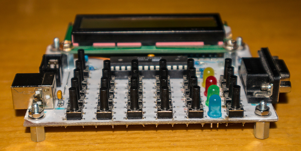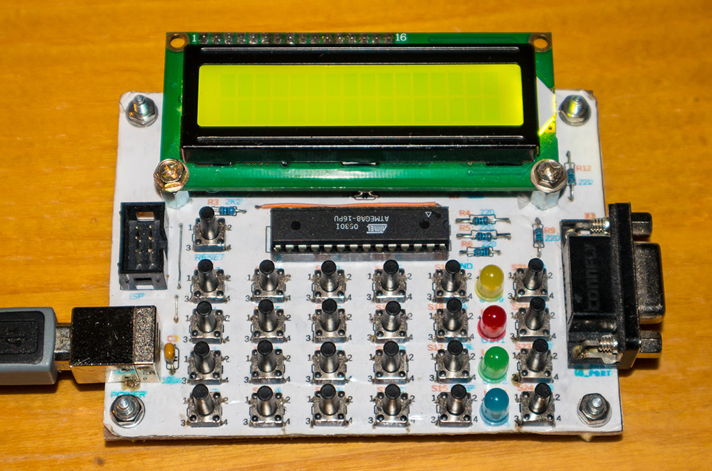 Konektor USB je využit pouze k napájení kitu z externí nabíječky +5V nebo z USB portu. Procesor používá interní RC oscilátor 8 MHz. Výstupy z procesoru jsou vedeny na LED diody přes rezistory 2K2 a na port přes rezistory 470. Hodnoty rezistorů pro LED diody bude možná potřeba přizpůsobit svítivosti použitých LED diod. Ke vstupním pinům portu jsou paralelně připojena tlačítka. Připojíte-li k portu výstupní signály, nepoužívejte tlačítka pro vstupy, aby nedocházelo ke zkratování připojených výstupů. Odpor R1 reguluje předpětí pro kontrast displeje. Pro jiný displej může být nutné změnit na jinou hodnotu, typicky u některých displejů je lepší hodnota 1K. Odpor R2 řídí intenzitu podsvícení displeje.
