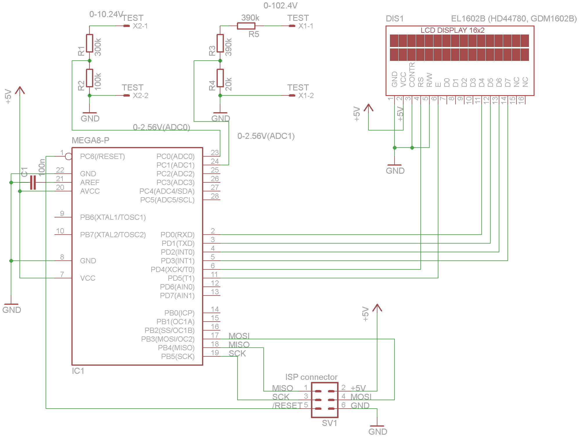 Using an A/D converter, 2 inputs are captured (10V and 100V ranges) and displayed as 2 values on the EL1602B LCD display. There is no PCB, just a schematic, it's just left in the form of a sparrow's nest. :-)