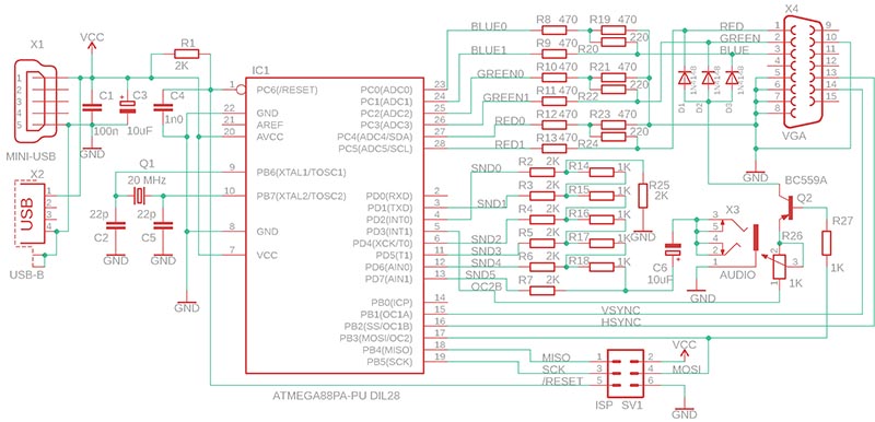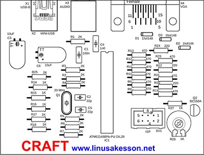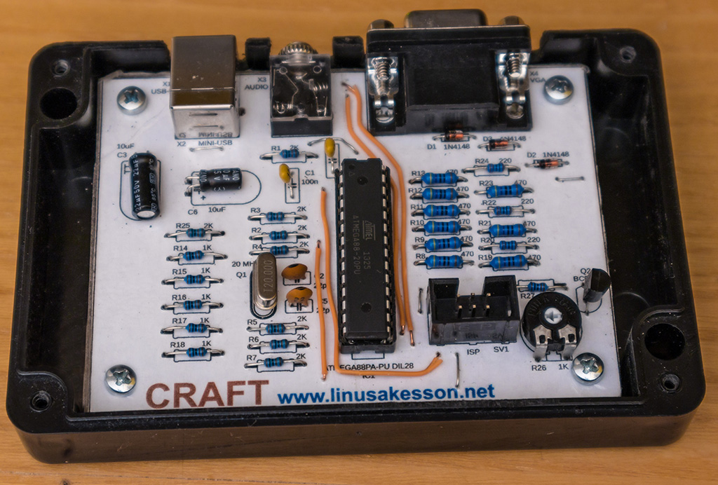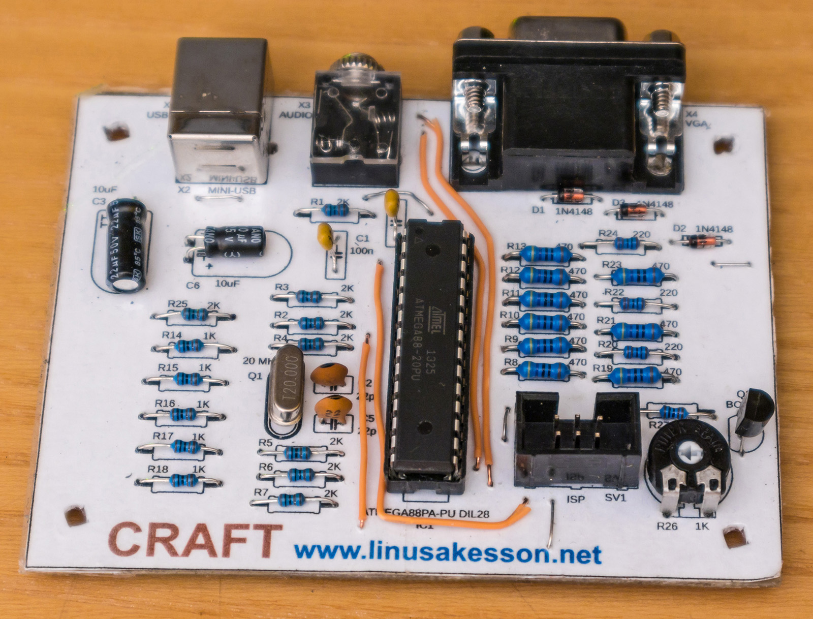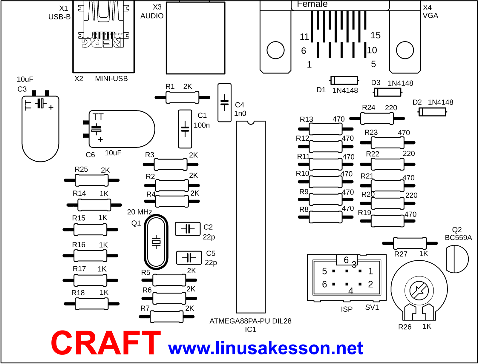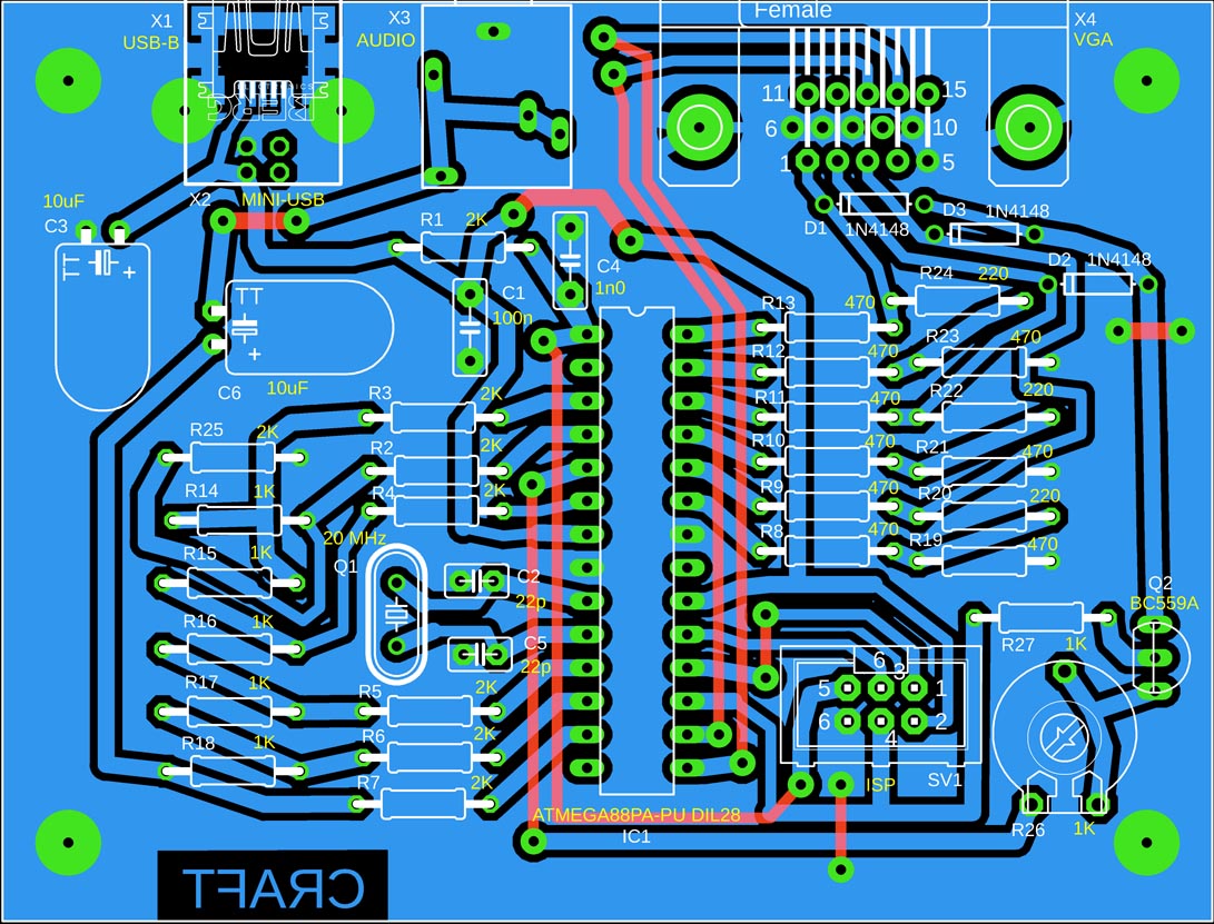 Craft is not my project. Its author is Linus Akesson. I was so impressed with Craft that I had to build it to see for myself that it actually does what it is supposed to do. And it did. :-) It was something to behold. Engaging animation with great music. So here is a redrawn detailed schematic with the PCB design.