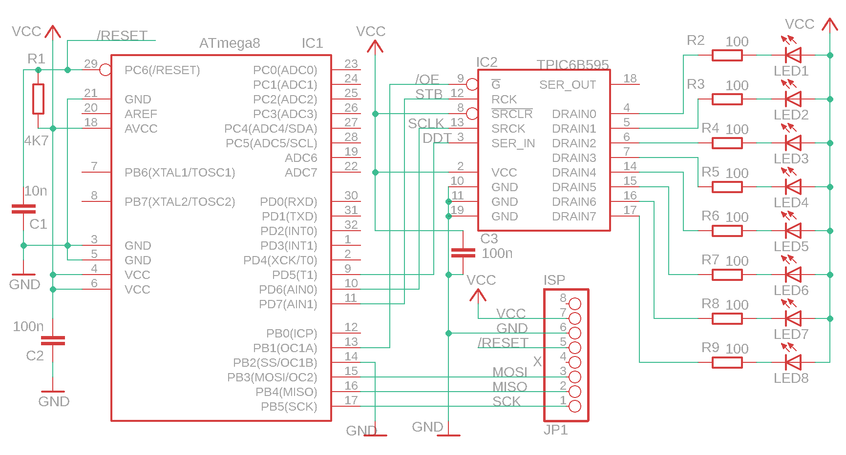 Jako ISP konektor je použita 8-pinová lišta KONPC-SPK-8 s následujícím obsazením pinů: