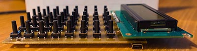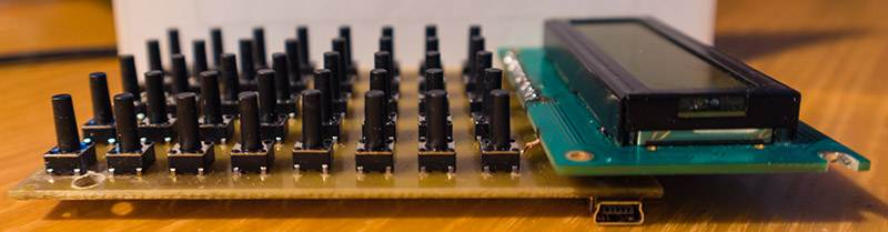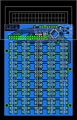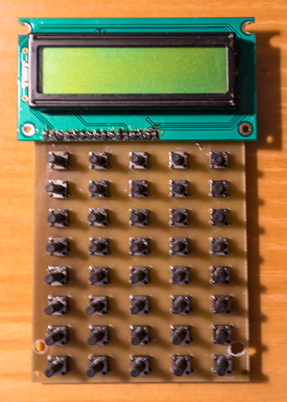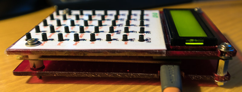 Pro maximální zjednodušení konstrukce byly jako tlačítka využity mikrospínače bez hmatníku, pouze vystupující nad plochu kalkulátoru. Displej je přiletován přes pinovou lištu. Plošný spoj byl zvolen rozměru 10x7.5 cm a to z toho důvodu, že je jednak tento rozměr v prodeji v GM a jednak splňuje omezení velikosti desky pro free verzi Eagle. Plošný spoj postačí jednostranný, doplněný 5 drátovými propojkami. Konstrukce byla pro jednoduchost zvolena "sendvičová" - shora i zdola je plošný spoj sešroubován s plexi deskami. Ale nejsou nutné a kalkulačku lze snadno provozovat i bez krytu - postačí přes tlačítka položit papírovou šablonu s popiskami tlačítek.