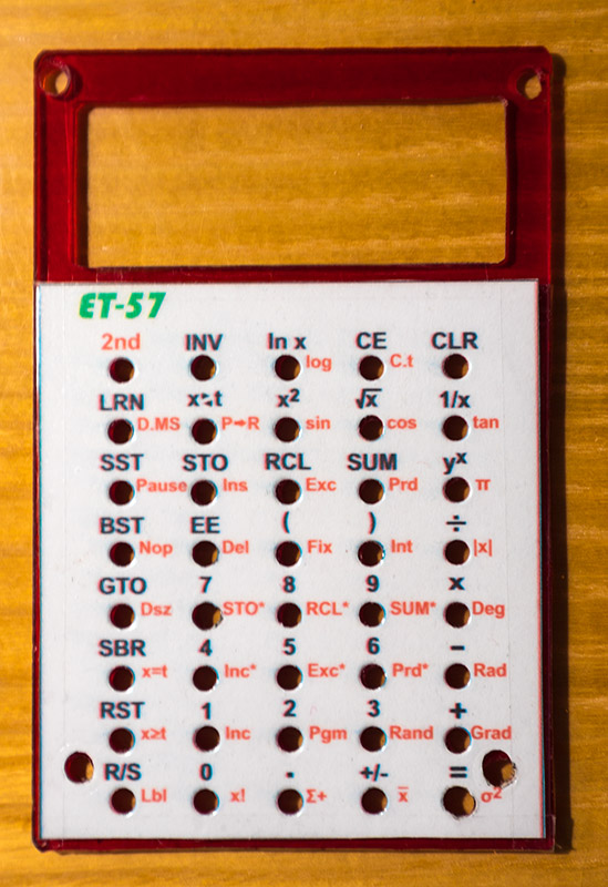 Horní a dolní kryt kalkulačky z plexiskla a přilepenou popiskou tlačítek: