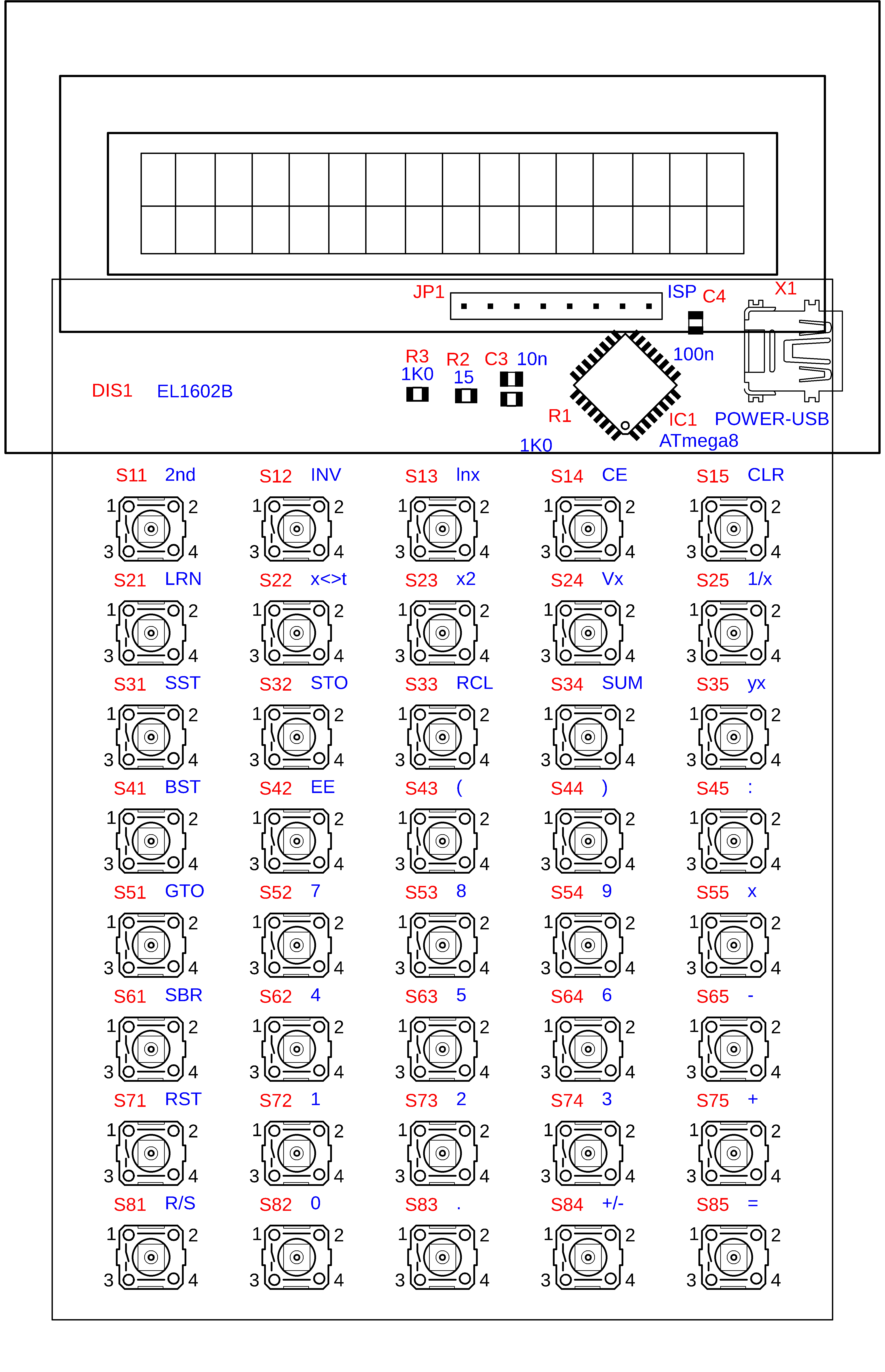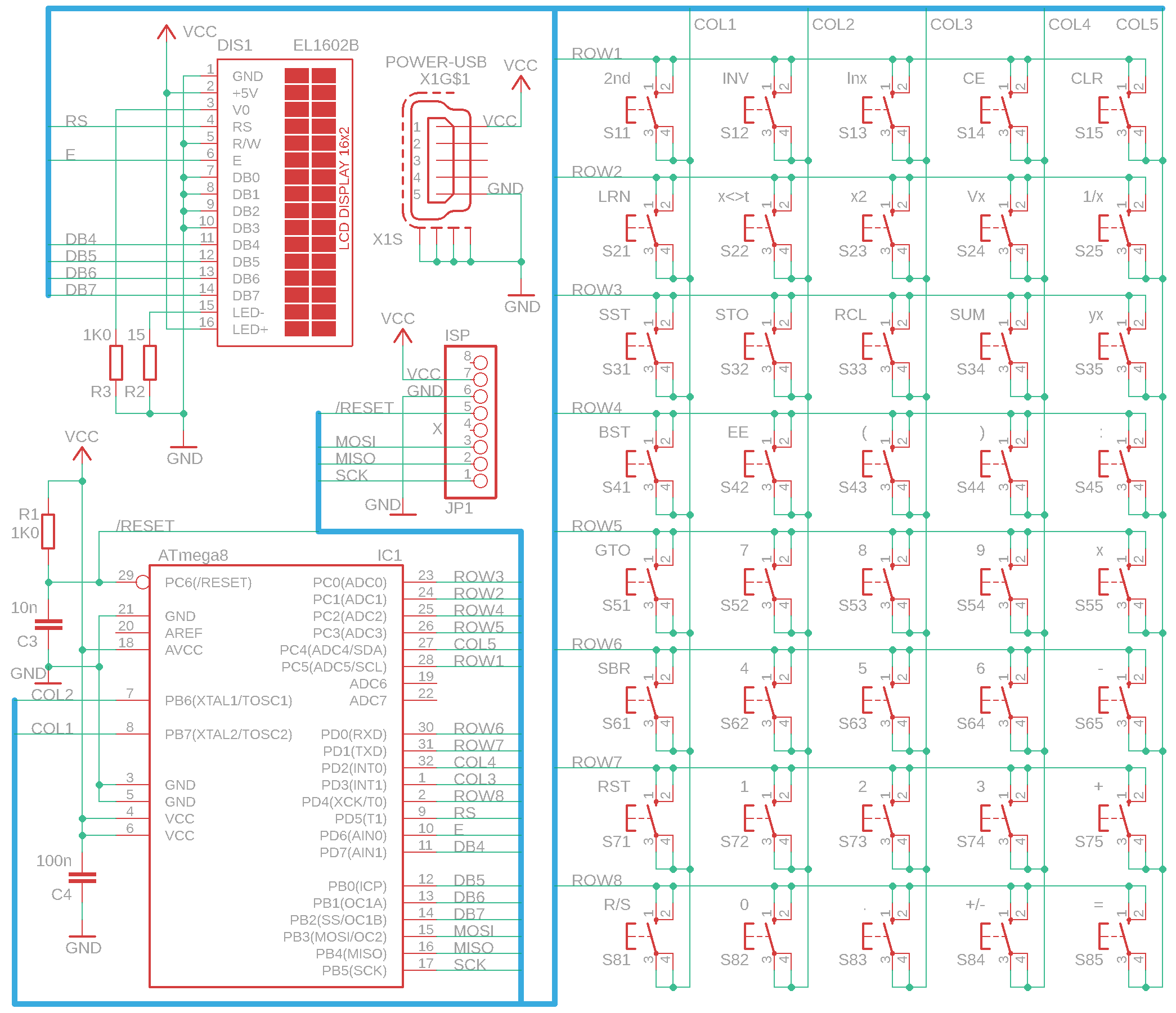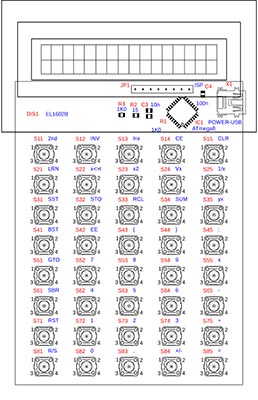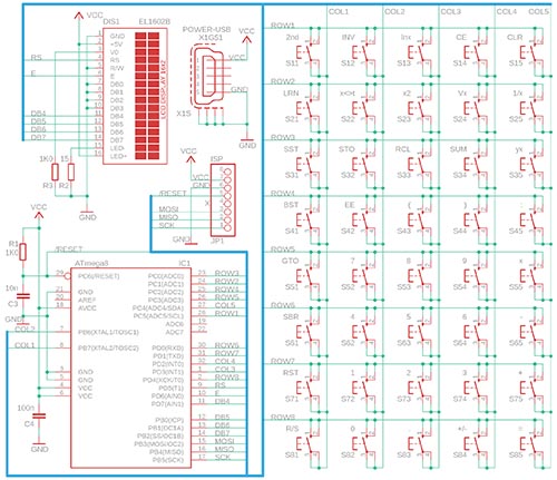 Konektor USB je využit pouze k napájení kalkulačky +5V z externí nabíječky nebo z USB portu. Procesor používá interní RC oscilátor 8 MHz. Odpor R2 slouží k omezení proudu LED pro podsvícení displeje. U této varianty displeje lze zřejmě vypustit a propojit přímo s GND (neověřeno). Odpor R3 reguluje předpětí pro kontrast displeje. Pro jiný displej může být nutné změnit na jinou hodnotu.