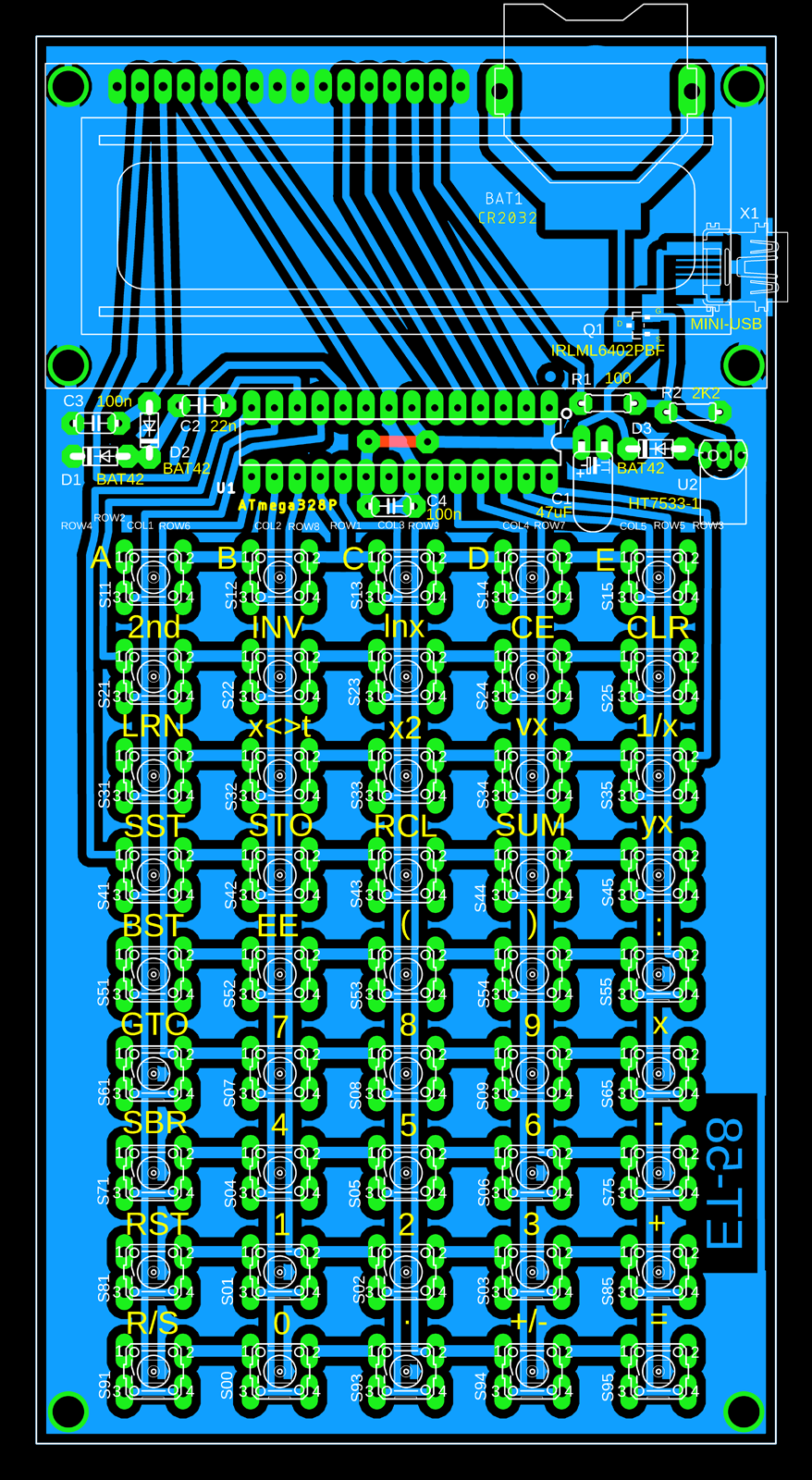 Stane-li se vám tedy někdy, že se kalkulačka stane nefunkční a to přestože ji připojíte na externí napájení +5V (může se stát při manipulaci se slabší baterií), odpojte externí napájení, vyjměte baterii a nechte kalkulačku několik minut bez napájení. Po několika minutách připojte externí napájení, kalkulačka by měla správně naběhnout. S baterií z těchto důvodů raději manipulujte při připojeném externím napájení. Potřebnou čekací dobu několika minut můžete zkrátit, když zkratujete filtrační elektrolytický kondenzátor v napájení (ten je schopen udržet stav kalkulačky při vypnutém napájení po několik minut).