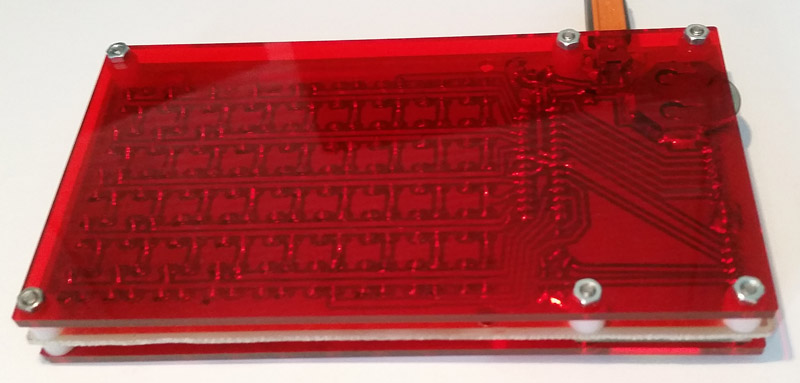 7) Sešroubujte kryty kalkulačky. Spodní kryt je od plošného spoje oddělen 6 velkými plastovými podložkami. Mezi displej a plošný spoj jsou vloženy 4 menší plastové podložky. Horní kryt je od plošného spoje dole oddělen 2 velkými plastovými podložkami a od displeje je oddělen 4 kovovými podložkami. Šroubky jsou do dolního krytu zašroubovány pomocí mosazných vložek se závitem. U některých krytů se může stát, že mosazné vložky nedrží dobře v krytu - v tom případě je v krytu zakápněte vteřinovým lepidlem (pozor ať se lepidlo nedostane do závitu), nebo použijte delší šroubky a zajistěte je zespodu matkami.