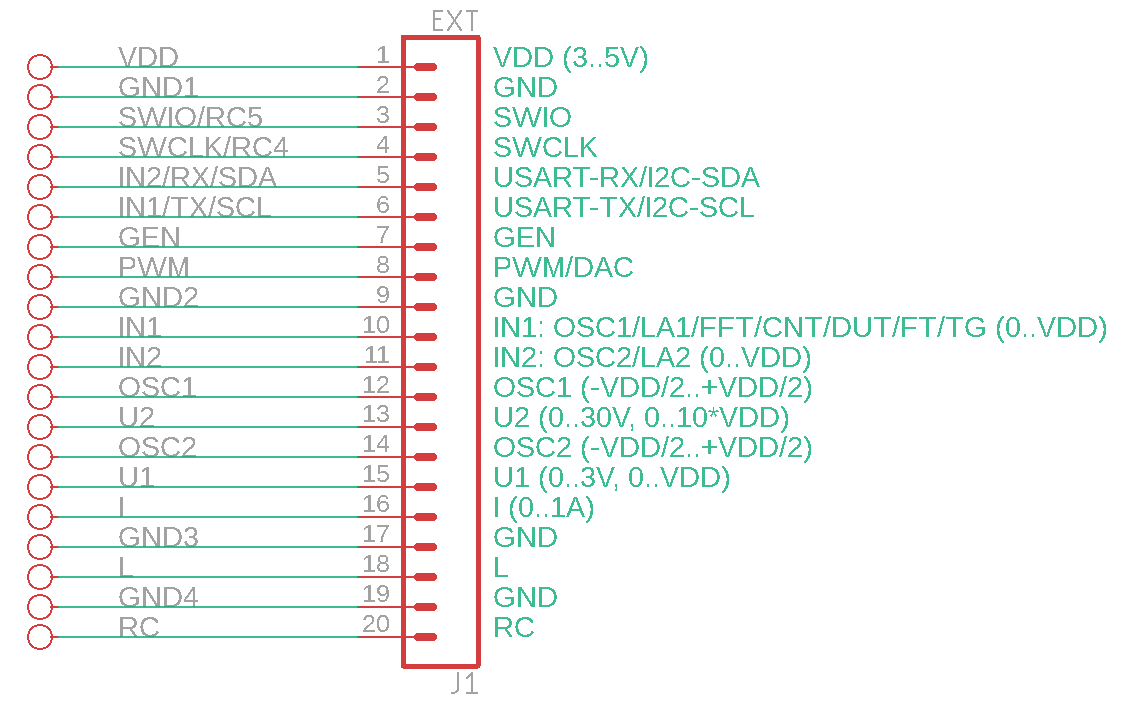 1 VDD ... Napájecí napětí PidiMetu. Při připojení PidiMetu na USB napájení lze z tohoto pinu odebírat napětí i pro testované zařízení. Úroveň napětí lze volit pomocí propojky "USB Power" buď 3.3V nebo 5V. Nepoužívá-li se USB napájení, lze PidiMet napájet pomocí tohoto pinu z externího zdroje nebo přímo z testovaného zařízení.