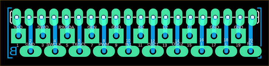 20 I2C Scanner - scanner I2C adres. I2C scanner slouží k detekci adres zařízení připojených na I2C sběrnici. Na pin "5 RX/SDA" se připojí SDA signál I2C sběrnice, na pin "6 TX/SCL" se připojí SCL signál I2C sběrnice. Komunikace přes I2C sběrnici probíhá v módu s otevřeným kolektorem, s pull-up rezistorem o hodnotě zhruba 45 kOhm. Napětí odpovídá zvolenému napájecímu napětí - pozor ať nepoškodíte zařízení podporující pouze 3.3V připojením na sběrnici 5V.