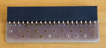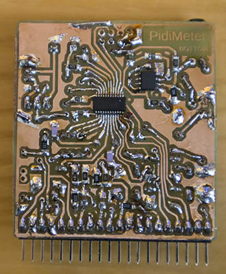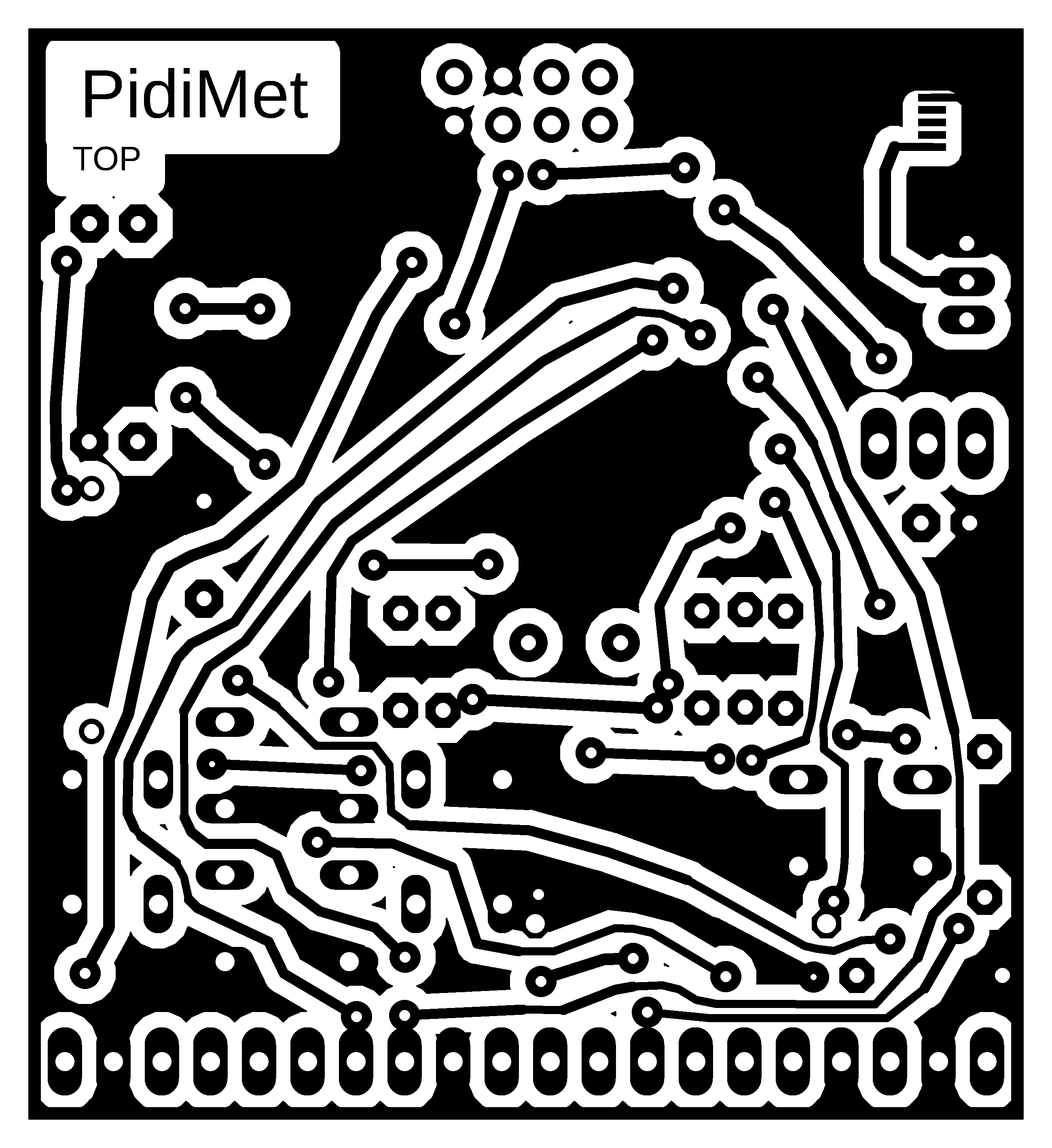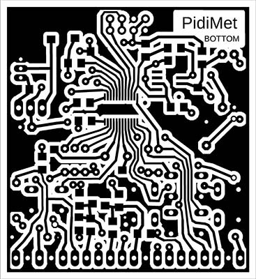 Zde uvedený plošný spoj doporučuji použít pouze v případě, že nemáte jinou možnost s lepším návrhem. Účelem tohoto návrhu bylo vytvořit prototyp pro možnost programování PidiMetu. Návrh je ovšem přizpůsobený tomu, že plošné spoje vyrábím v domácích podmínkách fotocestou - tedy se používají zbytečné průchodky a propojování pomocí vodičů, což by u profesionálního oboustranného PCB nebylo. Zřejmě kvůli špatnému návrhu se projevuje i chyba - choulostivost na vysoké frekvence, jako občasné zamrzání procesoru při generování 24 a 48 MHz s napájením 5V.