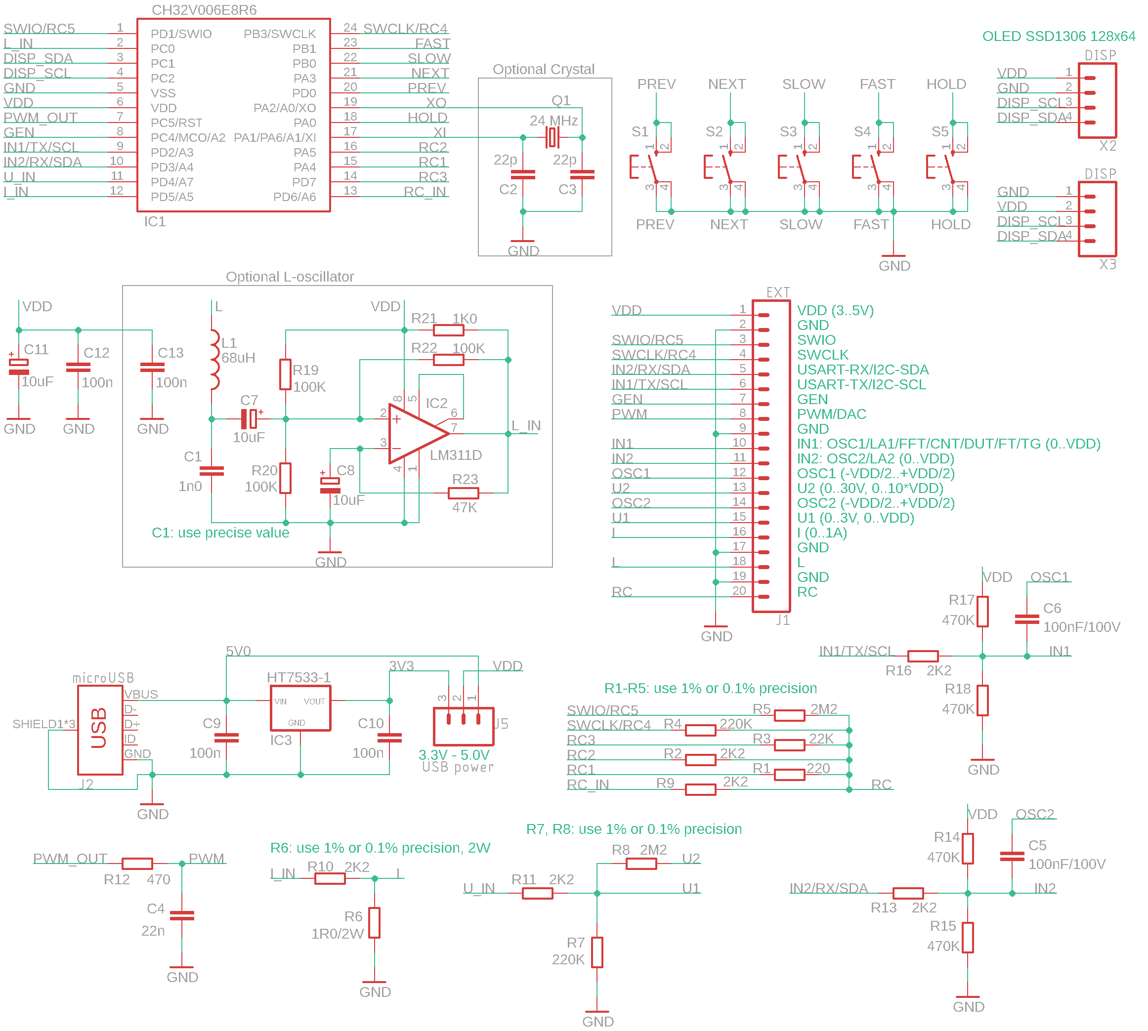 Poznámka: Vstup U2 je na konektoru EXT fyzicky umístěn mezi signály OSC1 a OSC2. Je to z důvodu bezpečnosti. Vstupy OSC1 a OSC2 jsou opatřeny kondenzátory 100nF, které ochrání procesor v případě, že dojde k nechtěnému kontaktu vodičů vysokého napětí U2 se sousedními piny konektoru. Z toho důvodu by měly být kondenzátory na vstupech OSC1 a OSC2 dimenzovány na dostatečně vysoké napětí (100V).