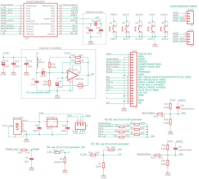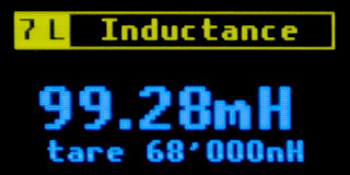 7 L Inductance Meter - měření indukčnosti cívek. K měření cívek se používá oscilátor s komparátorem LM311D. Měřená cívka se zapojí mezi pin "18 L" a zem "GND". Oscilátor kmitá na frekvenci dané paralelním referenčním kondenzátorem 1nF a sériovou referenční cívkou 68uH. Procesor měří generovanou frekvenci a z ní počítá indukčnost cívky.