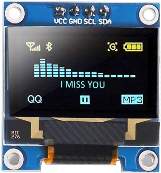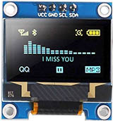Jako displej se používá OLED I2C 0.96" displej s řadičem SSD1306 a rozlišením 128x64, napájení 3 až 5V. Doporučuji použít dvoubarevný displej s 16 linkami žluté a 48 linkami modré, pro který byl software navržen. Displej naleznete např. zde: https://www.hadex.cz/m508c-displej-oled-096-128x64-znaku-iici2c-4piny-modrozluty/.