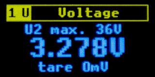 1 U Voltage - měření napětí. Napětí lze měřit na 2 vstupech konektoru. Na vstupu "15 U1" lze měřit kladné napětí v rozsahu od nuly až po napájecí napětí VDD. Je-li PidiMet přepnutý na 3.3V, lze měřit napětí do 3.3V. Je-li přepnut na 5V, lze měřit napětí do 5V. Na horním řádku se zobrazí, do jakého napětí lze měřit. Údaj se odvodí od aktuálního napájecího napětí, proto se může lišit. Nelze měřit záporné napětí - v takovém případě zůstane na displeji 0V a hrozí nebezpečí poškození PidiMetu. Na vstupu "13 U2" lze měřit kladné napětí v rozsahu od nuly až po 11-násobek napájecího napětí VDD. Na horním řádku displeje se opět zobrazí maximální měřitelné napětí. Pro bezpečnost, aby nedošlo k poškození PidiMetu opomenutím volby správného napájení, se typicky uvádí u vstupu U1 měření do 3V a u vstupu U2 měření do 30V. Přivedením napětí 5V na U1 nebo 50V na U2 při napájení 3.3V může dojít k poškození PidiMetu.