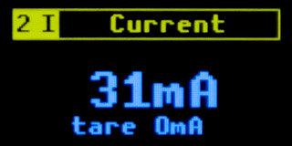 Při měření proudu se používá tarování společné se stránkou pro měření proudu. Tarování může být nutné provést z důvodu odchylek ADC převodníku. Tarování můžete provést na stránce měření proudu "2 I", nebo na této stránce. Spojte vstup "I" se zemí "GND" a stiskněte dlouze tlačítko HOLD (po dobu alespoň 1/2 sekundy). Provede se tarování - zaznamená se aktuální hodnota proudu, která se bude odečítat od naměřeného údaje. Aktuální hodnota "tare" se zobrazuje na spodním řádku displeje.