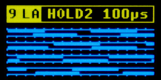 9 LA Logic Analyzer - logický analyzátor. Logický analyzátor umožňuje zobrazit digitální signály v jednom nebo ve dvou vstupních kanálech. V režimu jednoho kanálu se vstupní signál přivede na vstup "10 IN1". V režimu dvou kanálů se druhý signál přivede na vstup "11 IN2". V režimu jednoho kanálu se signál zobrazí rozděleně na 8 linkách. Na každé lince je 16 značek. Každá značka představuje jeden časový úsek. Celková doba zobrazeného signálu odpovídá 128 značkám.
