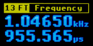 Na prvním řádku displeje se zobrazí naměřená frekvence, na druhém řádku je perioda signálu - vypočtená jako převrácená hodnota frekvence. Přesnost měření frekvence závisí především na frekvenci použitého krystalu. Naměřené údaje se zobrazí na 6 platných číslic. Běžné krystaly mají přesnost zhruba 50 ppm (což je 0,005%). To se může projevit chybou na posledních 2 číslicích naměřeného údaje.