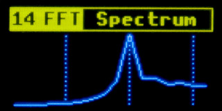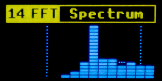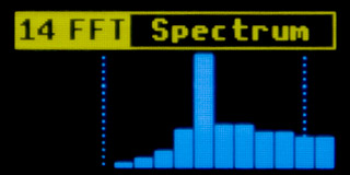 14 FFT Spectrum Analyzer - spektrální analyzátor. Spektrální analyzátor slouží k zobrazení spektra analogového signálu přivedeného na vstup "10 IN1". Spektrum se zobrazí v 16 pásmech s logaritmickým rozložením frekvencí v rozsahu 16 Hz až 16 kHz. K analýze signálu se používají filtry 2. řádu IIR biquad s Q=10. Samplovací frekvence ADC je 44100 Hz. Refresh displeje má frekvenci 22 FPS. Zobrazené grafy používají filtraci attack a decay (rychlý náběh a pomalý sestup).