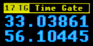 17 TG Time Gate - časová brána. Časová brána je měření času klíčovaného úrovní vstupního digitálního signálu na pinu "10 IN1". První řádek počítá čas po dobu, kdy je vstupní signál v úrovni HIGH. Druhý řádek počítá čas po dobu, kdy je vstupní signál v úrovni LOW. Vstupní signál se sampluje s frekvencí 100kHz, s intervaly 10us. Časovače přetékají po době 11 hodin a 55 minut. Tlačítkem HOLD se pozastaví aktualizace displeje - čítače mezitím ale běží dále. Tlačítkem SLOW se provede reset čítačů i zobrazených hodnot.