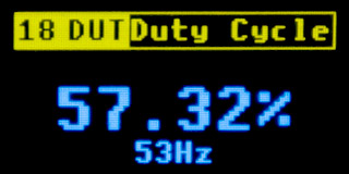 18 DUT Duty Cycle - měření střídy signálu. Funkce měří poměr šířky pulzů úrovně HIGH digitálního signálu, přivedeného na vstup "10 IN1", k periodě signálu. V prvním řádku se zobrazuje střída signálu v procentech, v druhém řádku se zobrazuje přibližná frekvence signálu. Lze měřit signály o frekvenci 4Hz až 400kHz. Ovšem u frekvencí kolem 400kHz je potřeba počítat s tím, že jde o frekvence na hranici schopností tohoto měřicího módu. Může se stát, že při vysoké frekvenci signálu dojde k zahlcení obsluhy přerušení, kdy program přestane být schopen obsluhovat hlavní programovou smyčku. V tom případě zafunguje watchdog, který po 3 sekundách neaktivity PidiMet resetuje. Je nutné také počítat s tím, že v případě vysokých frekvencí, nebo pokud je zdroj signálu "měkký" (má vysokou výstupní impedanci), může dojít k deformaci hran signálu, která se projeví nepřesností naměřeného údaje.