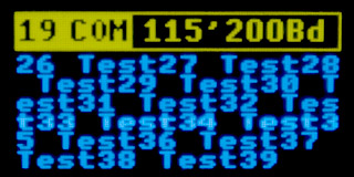 Při testu se na vysílací pin TX vysílají testovací vzorky obsahující text "Test" a číslo, které se postupně inkrementuje. Vzorky se vysílají v 1-sekundových intervalech. Data přijatá z přijímacího pinu RX se zobrazují na displeji. Program interpretuje řídicí kódy CR (reset pozice na displeji na začátek aktuálního řádku) a LF (posun na začátek dalšího řádku). Ostatní data zobrazuje jako platné znaky. Znaky s kódem 128 a výše se zobrazí jako invertované znaky.