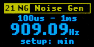 21 NG Noise Generator - generátor šumu. Generátor šumu generuje digitální signál s náhodnými šířkami pulzů LOW i HIGH na výstupním pinu "7 GEN". Tlačítky SLOW a FAST lze volit rozsah generovaných šířek pulzů v rozsahu 2us až 50ms. Tlačítkem HOLD lze volit, zda se tlačítky SLOW/FAST nastavuje horní nebo dolní mez rozsahu generovaných pulzů. Je-li minimální hodnota vyšší než maximální, program si údaje zamění. Na prvním řádku displeje se zobrazí aktuálně nastavené meze generovaných pulzů. Na prostředním řádku se zobrazí odpovídající střední frekvence, jak by ji detekoval měřič frekvence s dlouhou dobou měření. Na dolním řádku se zobrazí mód nastavení, zda se nastavuje minimum (první hranice) nebo maximum (druhá hranice) mezí generovaných pulzů. Nelze nastavit obě meze na hodnotu 2us - ošetření, které by program nestíhal generovat.