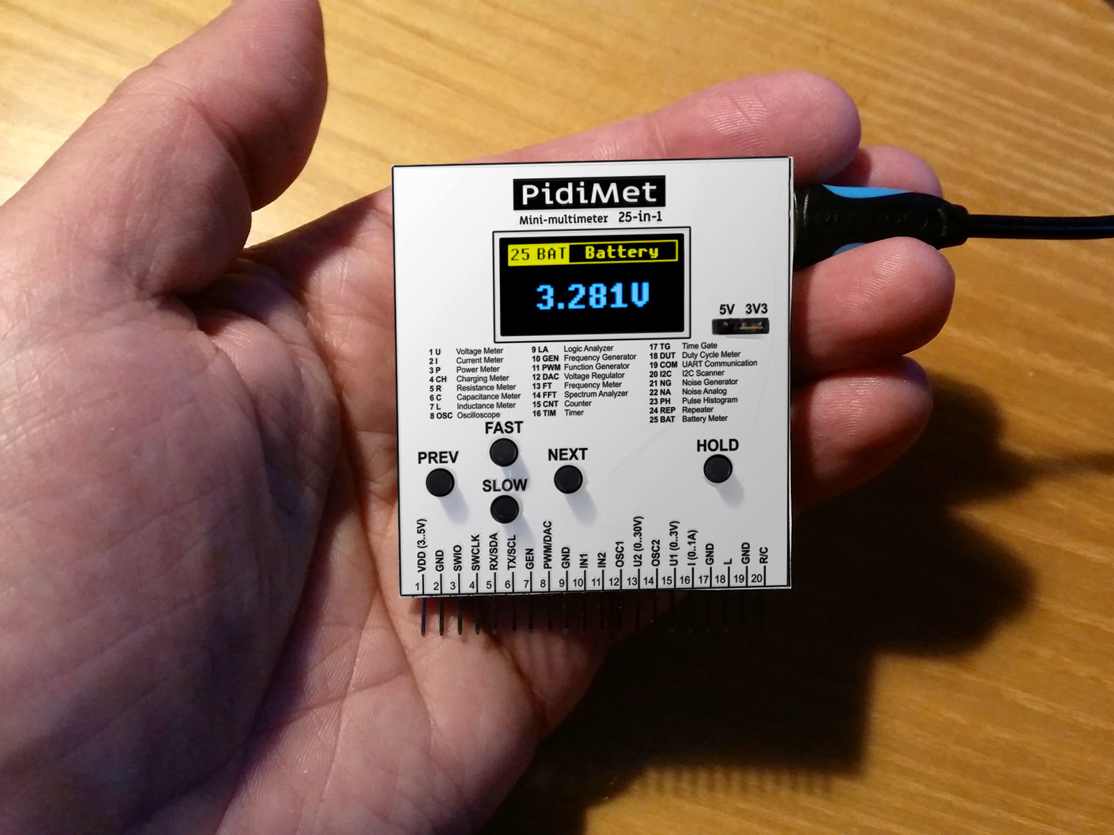 PidiMet je malý levný univerzální multimetr s 25 funkcemi a procesorem CH32V006. Obsahuje měření napětí, proudu, příkonu, nabíjení, rezistence, kapacity, indukčnosti, osciloskop, logický analyzátor, frekvenční generátor, generátor funkcí, napětový regulátor, měřič frekvence, spektrální analyzátor, čítač, časovač, hradlovaný čas, duty cyklus, UART komunikace, I2C scanner, šumový generátor, analogový šum, pulzní histogram, opakovač a měřič baterie.