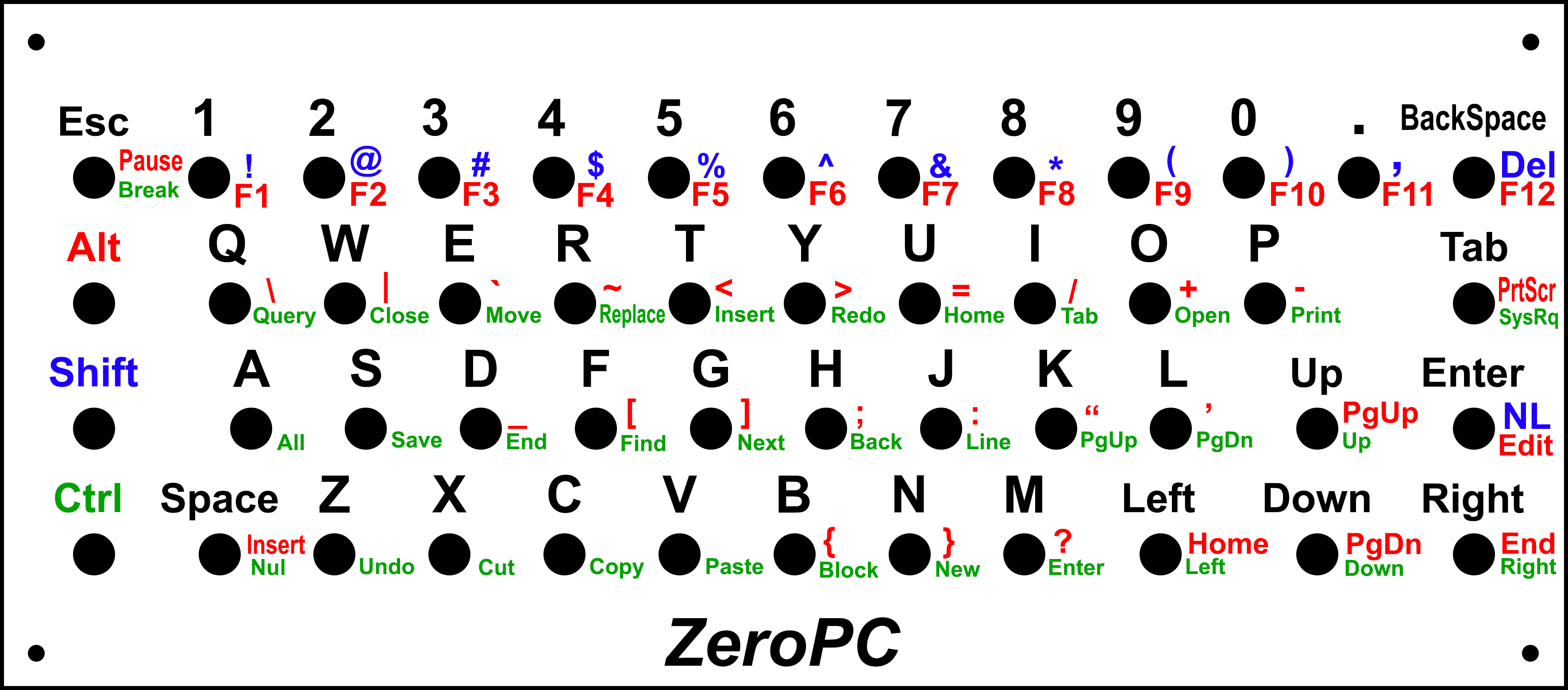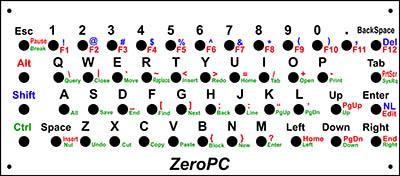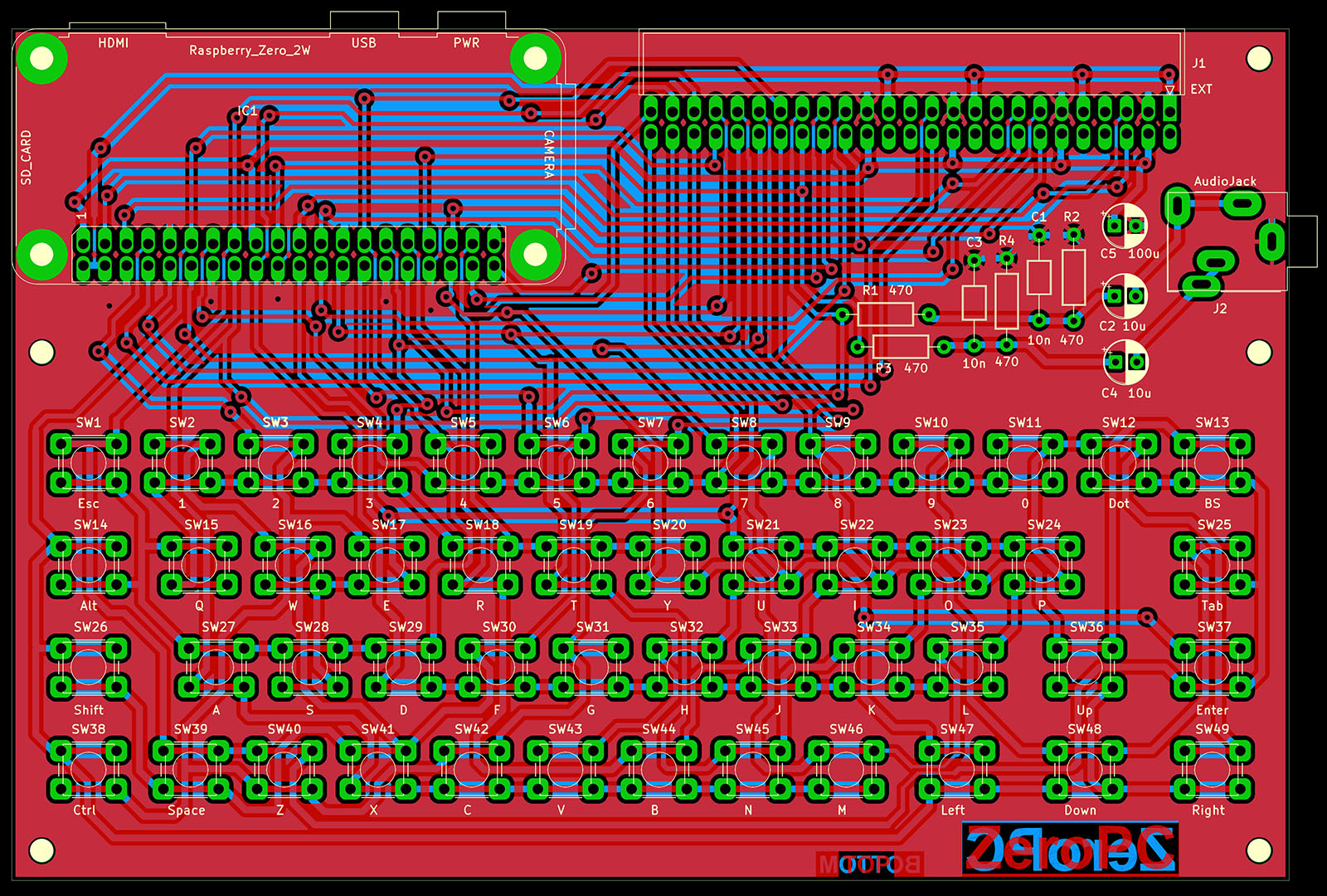 ZeroPC je malý počítač založený na modulech Raspberry Zero 1 nebo Zero 2. Běžně se předpokládá použití s modulem Zero 2 v 64-bit módu. Kromě modulu obsahuje ZeroPC stereofonní zvukový PWM výstup, výstup na HDMI displej, externí konektor pro připojení periferií a interní klávesnici z 49 mikrospínačů. K dispozici je boot loader umožňující snadné spouštění programů z SD karty.