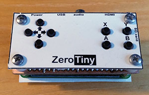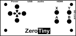 ZeroTiny je nejjednodušší herní konzole s moduly Raspberry Zero 1 nebo Zero 2. Přednostně se doporučuje používat modul Zero 2 v 64bitovém módu. Modul Zero 1 může být v některých aplikacích znatelně pomalejší. ZeroTiny obsahuje 8 tlačítek, stereofonni zvukový PWM výstup a výstup na HDMI displej. K dispozici je boot loader umožňující snadné spouštění programů z SD karty.